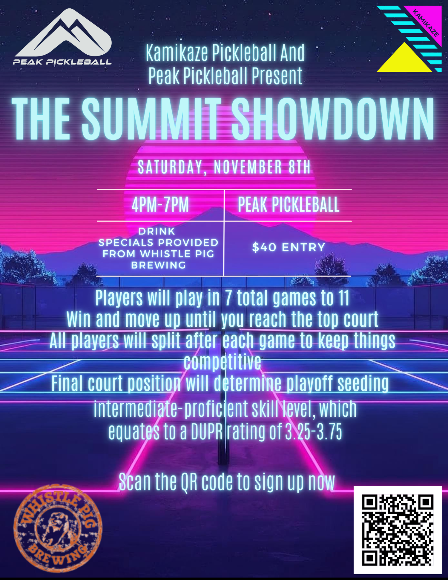 Join us for our first event in Colorado Springs! Weve partnered with Peak Pickleball to bring you a ladder style tournament with drink specials provided by Whistlepig Brewing,